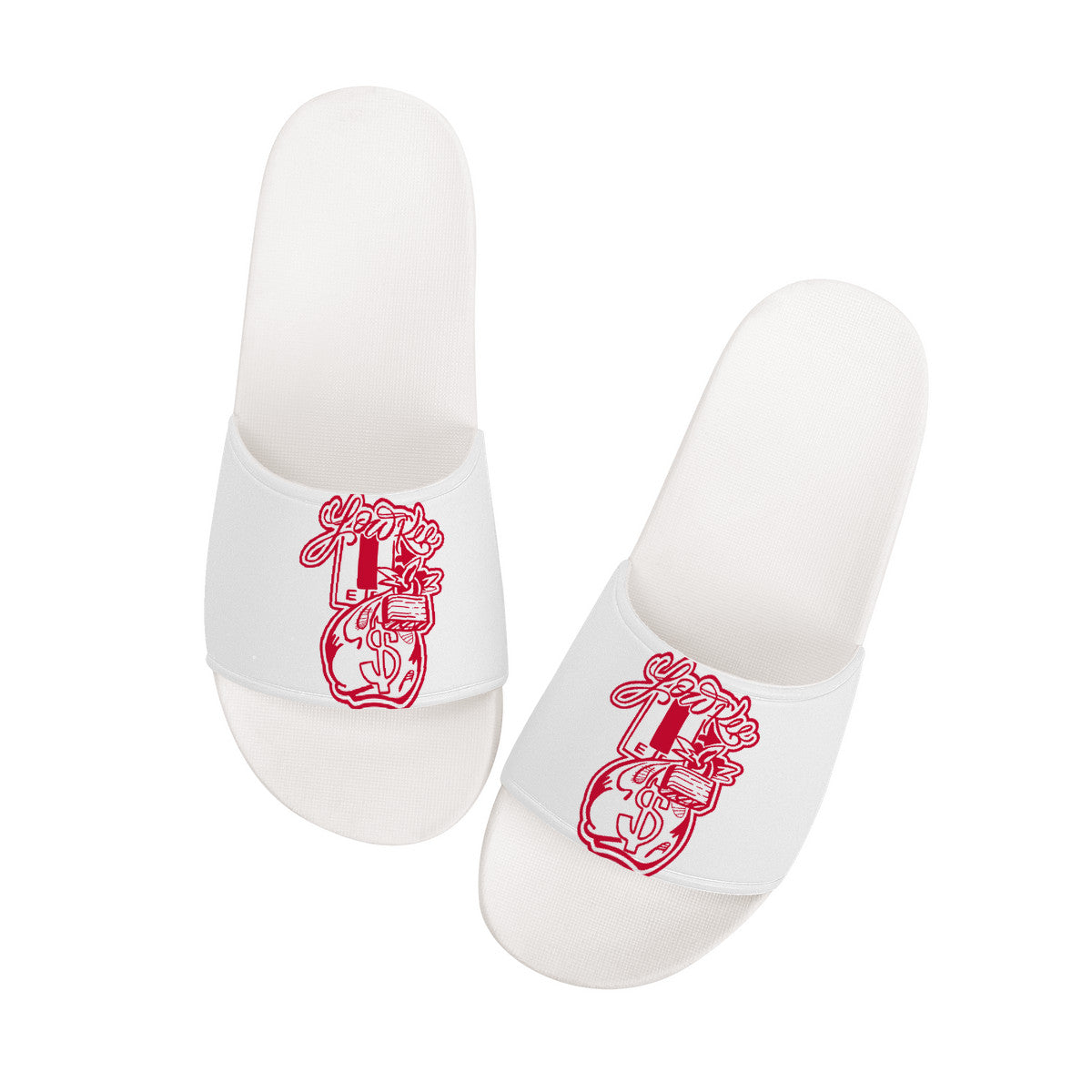Step heavy in style with the Money Moves Slides. Built for comfort but stamped with hustle energy, these crisp white slides feature a bold red money bag graphic that screams grind mode.